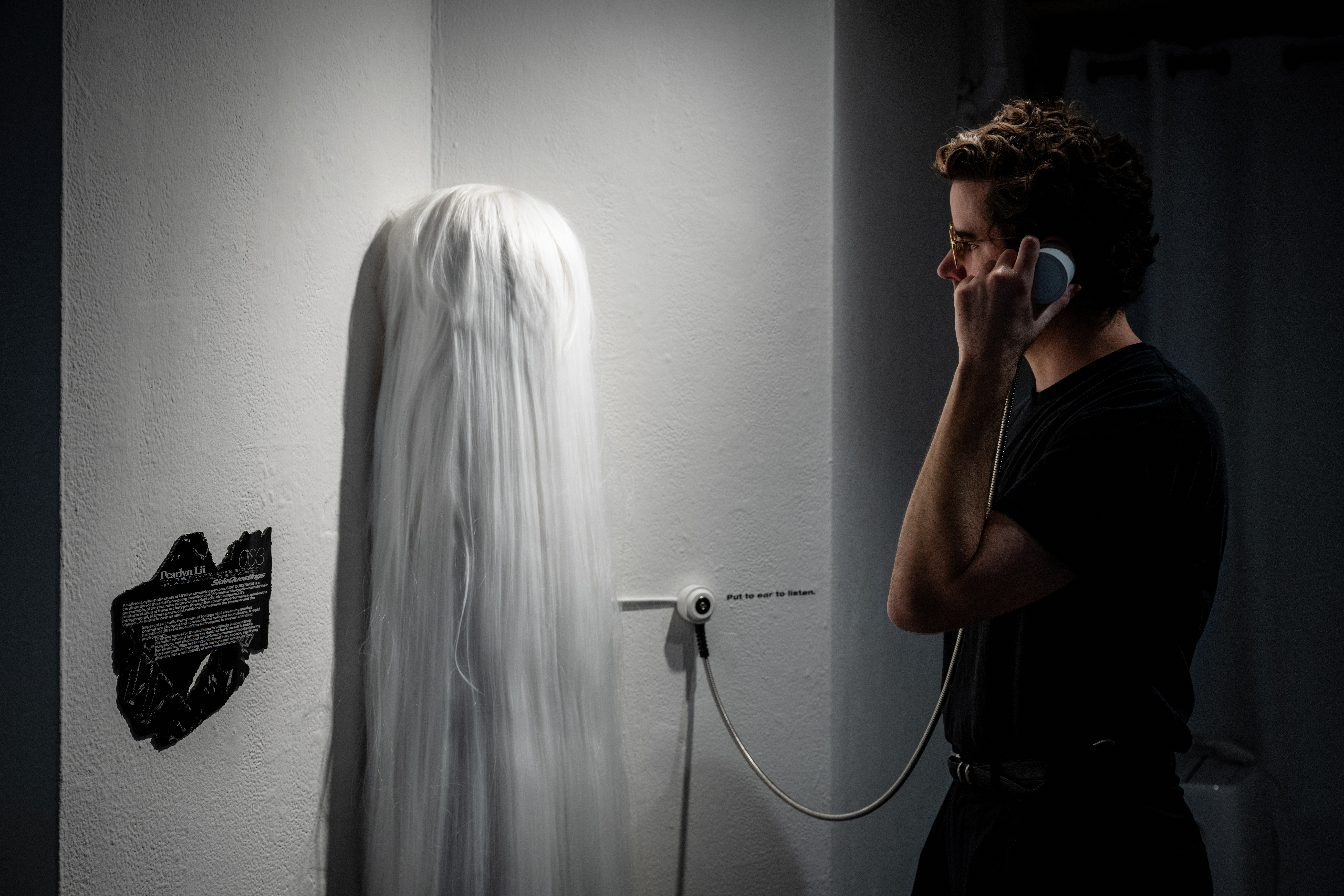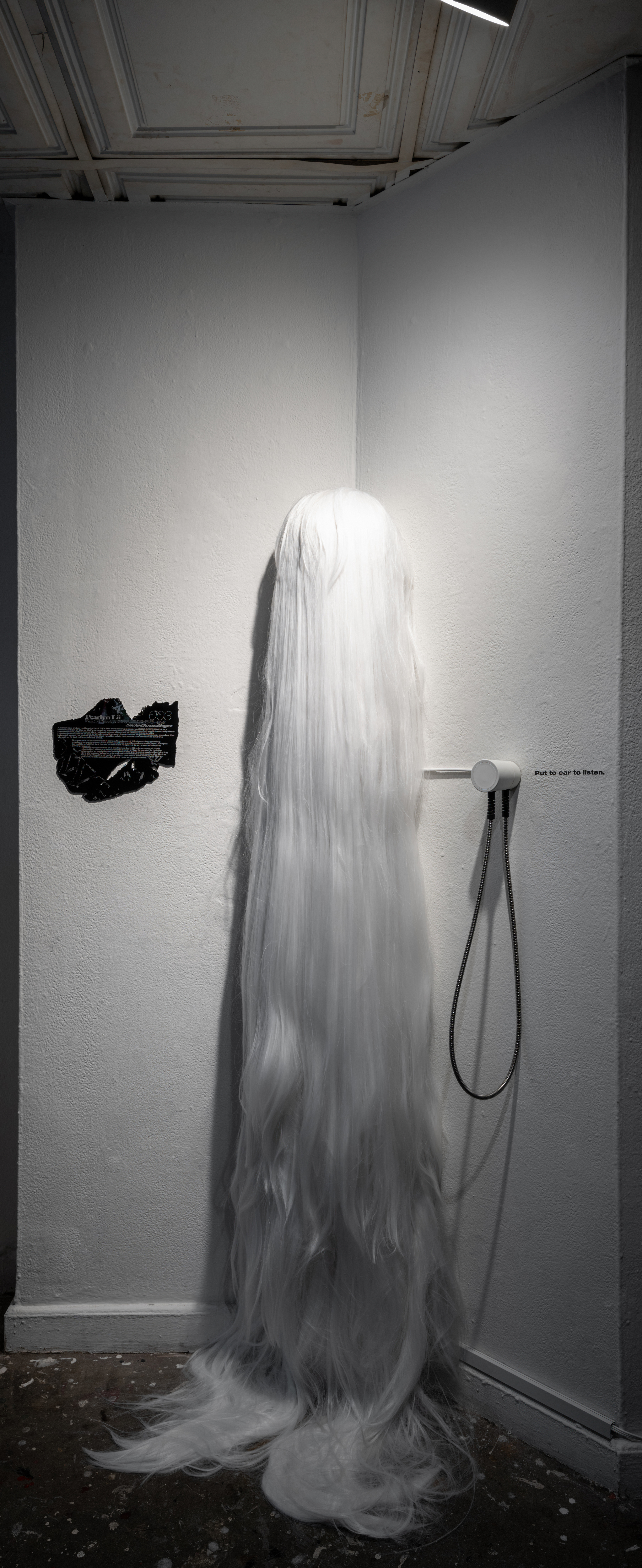Supercuts of audio from hours of footage of Lii streaming gaming content are chopped and screwed into a collaged soundscape. A rapid turnstile of different faces of the self respond to an ever-changing environment. Lii opens space for the audience to willingly suspend their disbelief, where a temporary death of her true self is held in purgatory, and displaced by various personas embodied during live streams. Wigs are hung on the wall in a cascade, signifying the eventuality of retiring each persona and avatar, as they dissolve into a multiplicity of new embodiments.